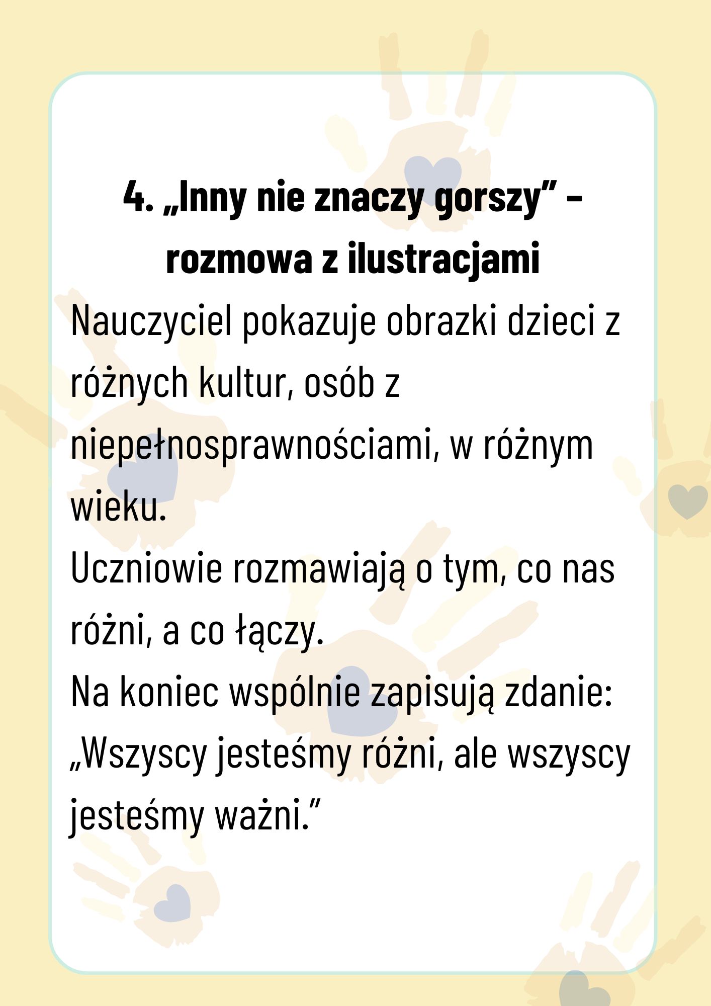 Zestaw kart pracy na Międzynarodowy Dzień Tolerancji (16 listopada) – gotowe scenariusze, zadania i materiał edukacyjny dla nauczycieli: rozmowy, kolorowanki, wykreślanki i gry integracyjne. Pomóż uczniom zrozumieć wartość różnorodności i szacunku.